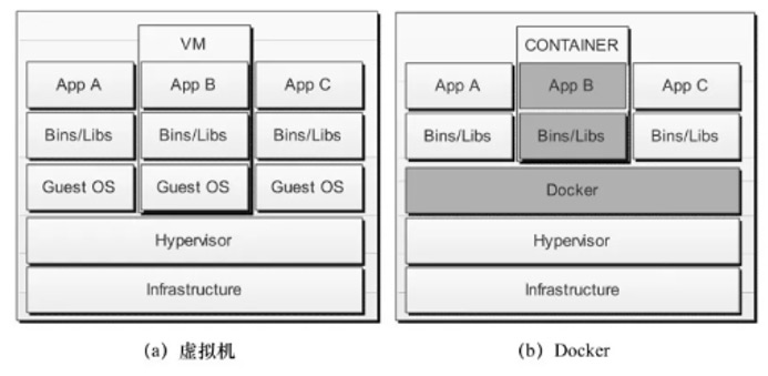了解了Docker的概念和特点后,相信很多人对Docker与虚拟机的区别会产生疑惑,那么它们到底有什么不同呢?下面通过一张对比图来说明两者的主要区别,如下图所示: