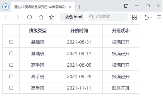 鼠标放到表格上整行变色效果怎么实现?现在有个黑马程序员HTML&JS+前端开发课程的开班表格,如下图所示:查看全文>>